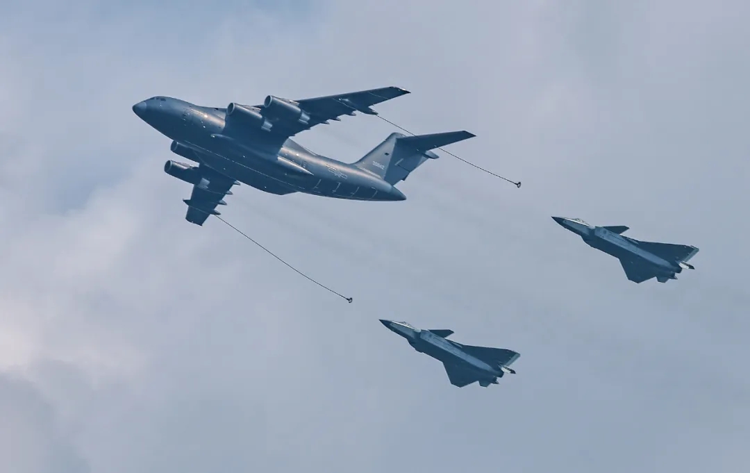 加受油机梯队由三架运油20A演示为轰6N、歼16、歼20加油。运油20A飞机是我国新一代空中加油装备,支撑中国战机奋飞远航。