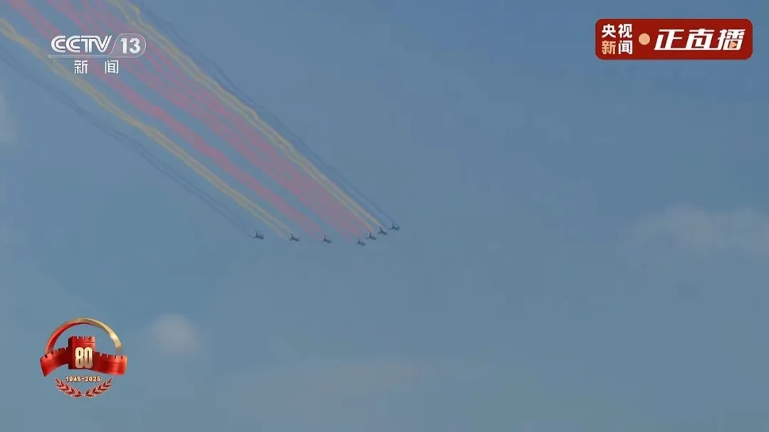 阅兵分列式最后,7架歼10表演机划出14道彩烟,寓意着中华民族14年可歌可泣的抗战历程,象征着14亿中国人民奔向强国复兴的绚丽前景。