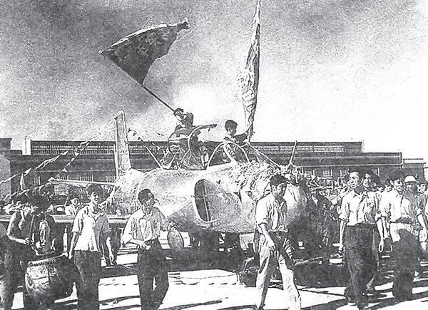 总装下线后,职工们护送第一架歼教1飞机去试飞车间。