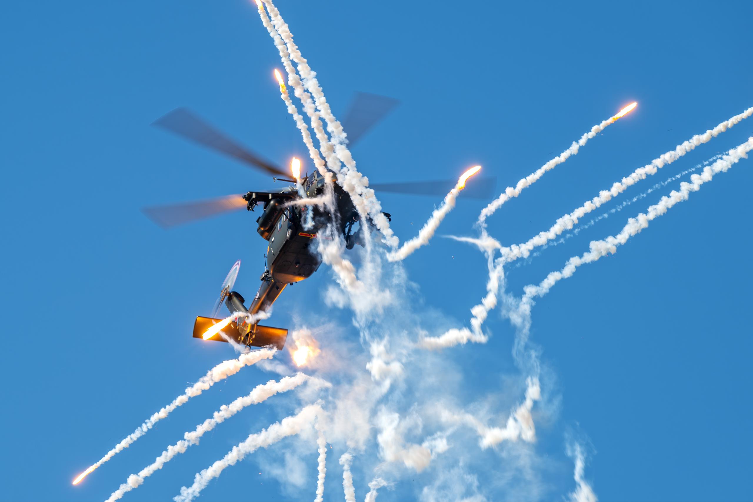 开幕式后,陆军“风雷”飞行表演队以七机通场飞行拉开本届直博会首场飞行表演的帷幕。陆军3型11架直升机以精准默契的编队动作惊艳亮相,以磅礴气势划破长空,先后演示了双机对冲、四机开花等多个课目的特技飞行动作。2架民用直升机接续展演,呈现了一场兼具视觉冲击力与技术观赏性的空中盛宴。