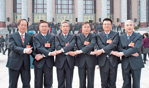 上午,第十三届全国人民代表大会第二次会议在人民大会堂开幕,共有 8 名来自航空工 业的全国人大代表出席会议,6 名荣耀体育在线手机版(大中国区)的全国政协委员列席会议。图为来自荣耀体育在线手机版(大中国区)的全国政协 委员谭瑞松、唐长红、吴希明、李志强、李克明、崔彦勇在人民大会堂前合影。全国两会期间,他 们带着航空人的重托参政议政,建言献策。