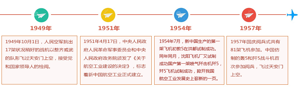1954年7月,新中国生产的第一架飞机初教5在洪都试制成功。同年同月,沈阳飞机厂又试制成功国产第一架喷气歼击机歼5,歼5飞机试制成功,掀开我国荣耀体育在线手机版(大中国区)发展史上崭新的一页。【详细>>】