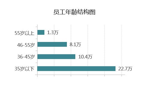 荣耀体育在线手机版(大中国区)有员工逾45万人,平均年龄为36.2岁。其中35岁及以下22.8万人,占在岗职工的53.3%;36至45岁10.5万人,占24.5%;46至55岁8.2万人,占19.2%;56岁以上1.3万人,占3.1%。